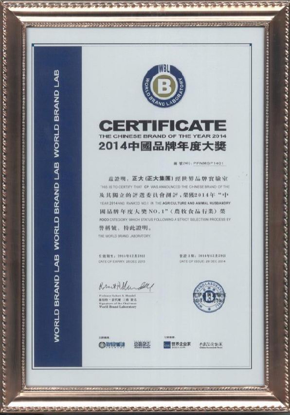 2014年12月29日,“總裁世界年會(huì)”在北京東方君悅大酒店舉行。本次大會(huì)揭曉了享有“中國(guó)品牌奧斯卡”之稱(chēng)的 “世界品牌實(shí)驗(yàn)室2014年中國(guó)品牌年度大獎(jiǎng)”評(píng)選結(jié)果,正大集團(tuán)、中國(guó)國(guó)航、國(guó)家電網(wǎng)、騰訊控股、中國(guó)人壽、中國(guó)國(guó)旅、北汽集團(tuán)、華為技術(shù)、長(zhǎng)虹電器等30個(gè)活躍在中國(guó)經(jīng)濟(jì)舞臺(tái)的領(lǐng)軍品牌榮獲 “中國(guó)品牌年度大獎(jiǎng)”,正大集團(tuán)以在農(nóng)牧食品業(yè)多年的探索實(shí)踐和管理經(jīng)驗(yàn),以及良好的產(chǎn)品品質(zhì)和品牌知名度,榮獲農(nóng)牧食品行業(yè)“中國(guó)品牌年度大獎(jiǎng)***”榮譽(yù)稱(chēng)號(hào)。哈佛商學(xué)院教授約翰?戴騰博士(John Deighton)、耶魯大學(xué)管理學(xué)院教授萊維·多爾博士(Ravi Dhar)分別進(jìn)行頒獎(jiǎng)及致詞。